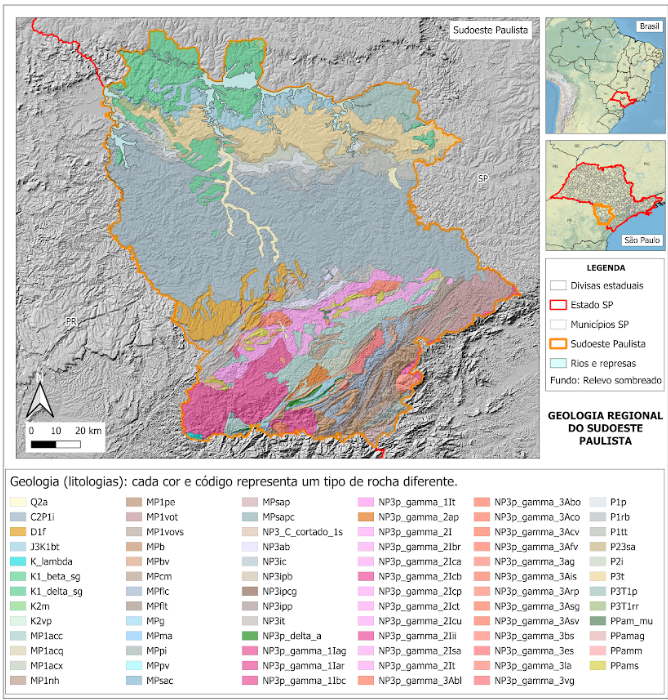 Figura 13 – Mapa Geológico do Sudoeste Paulista, feito a partir dos dados do Serviço Geológico Brasileiro (SGB/CPRM). Cada cor e cada código representa um tipo diferente de rocha. A descrição de cada código está no Quadro 1.