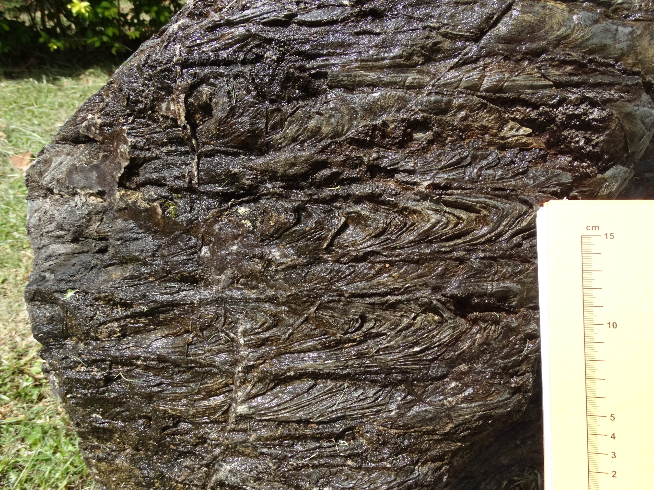 Figura 3 – Foto de um bloco de rocha com a presença de estromatólitos, exposta na Escola de Minas de Itapeva/SP. Cada linha na rocha mostra uma camada de crescimento dessa colônia de microrganismos primitivos, que viveram há 1 bilhão de anos.