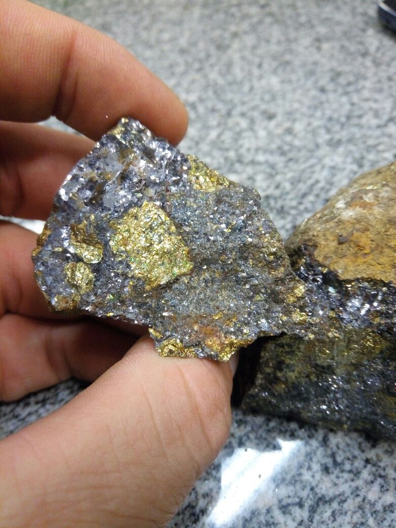 Figura 5 – Fragmento de uma rocha com minérios de chumbo (galena) e cobre (calcopirita), encontrada na cidade de Ribeira/SP.