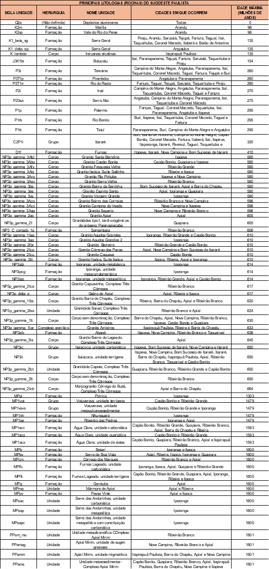 Para você que ficou um pouco mais curioso sobre as rochas que temos aqui e quer aprender mais sobre a Geologia, vou deixar a seguir uma imagem com o mapa geológico da nossa região, assim como um quadro com uma breve descrição dessas rochas, os nomes das formações, a idade delas e as cidades nas quais elas ocorrem.