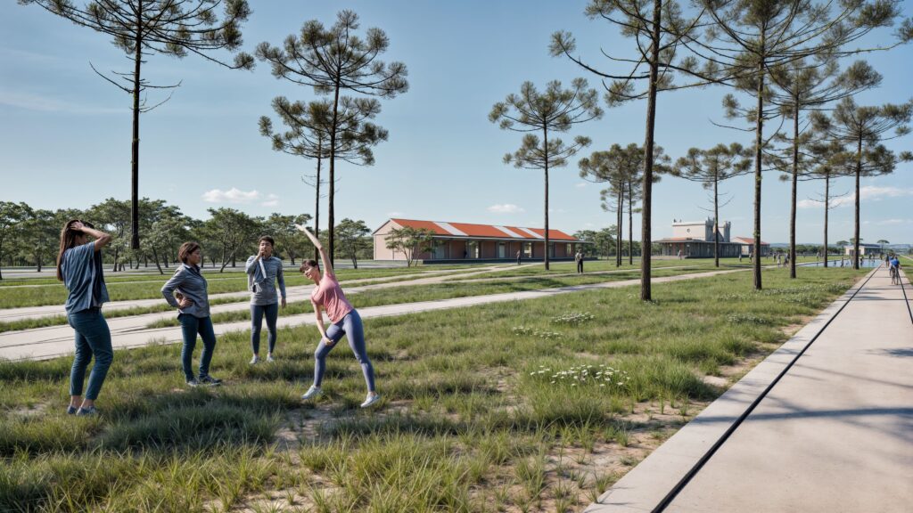 Pelo paisagismo são criadas várias atmosferas levando em consideração as diversas possibilidades de uso como: pontes sobre o córrego, praça seca frente a edificações principais, jardins de grama e água, espaço para exposições e festividades. Busca-se se criar ao mesmo tempo um conjunto de espaços acolhedores e seguros para pessoas de todas as idades, combinando com a configuração de um recinto para grandes celebrações, como a de aniversário da cidade.