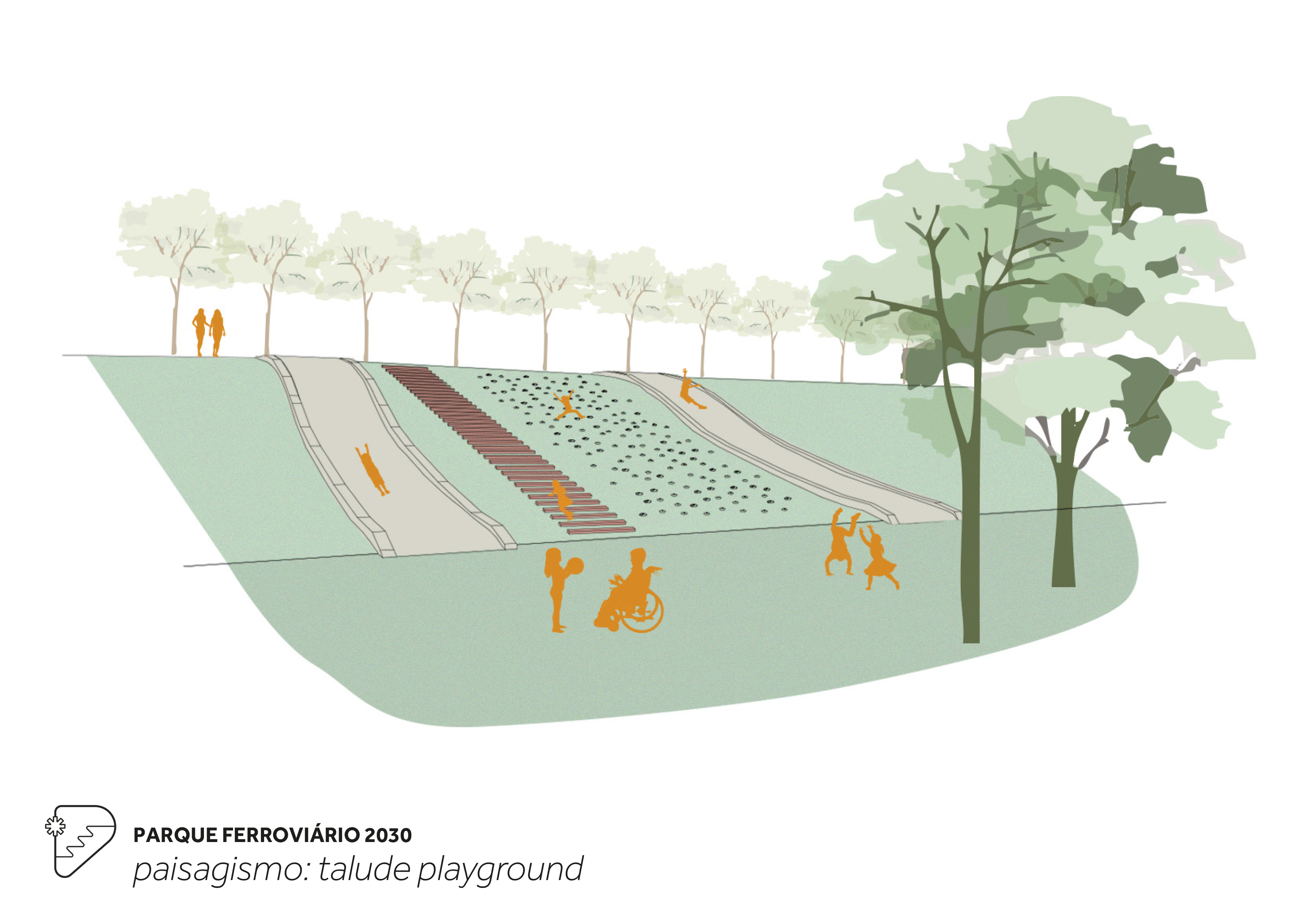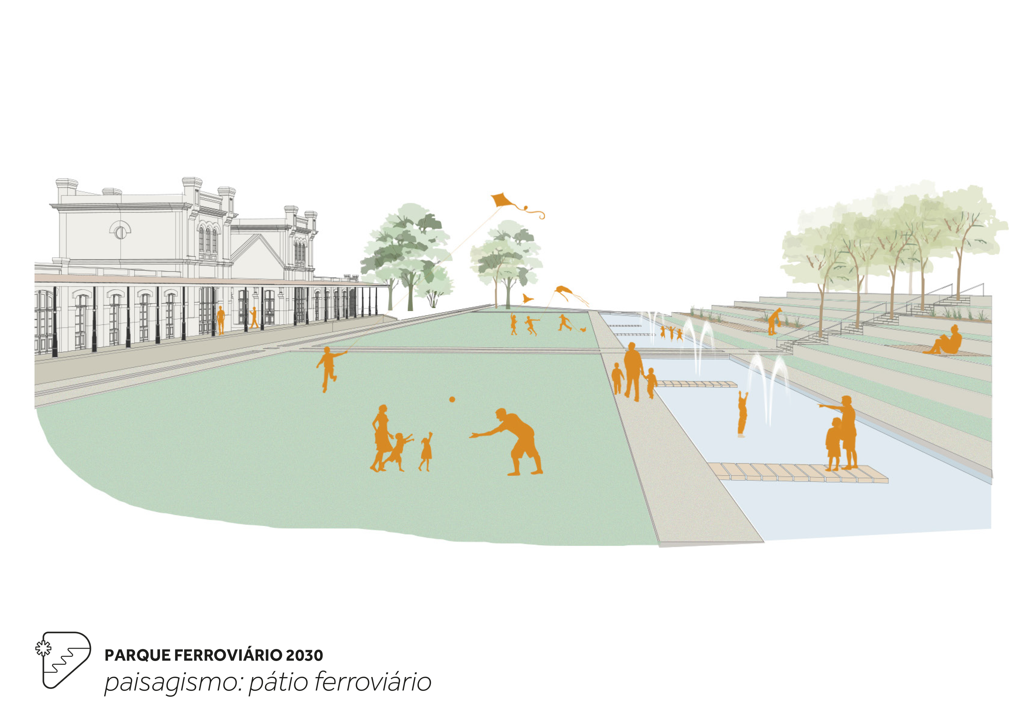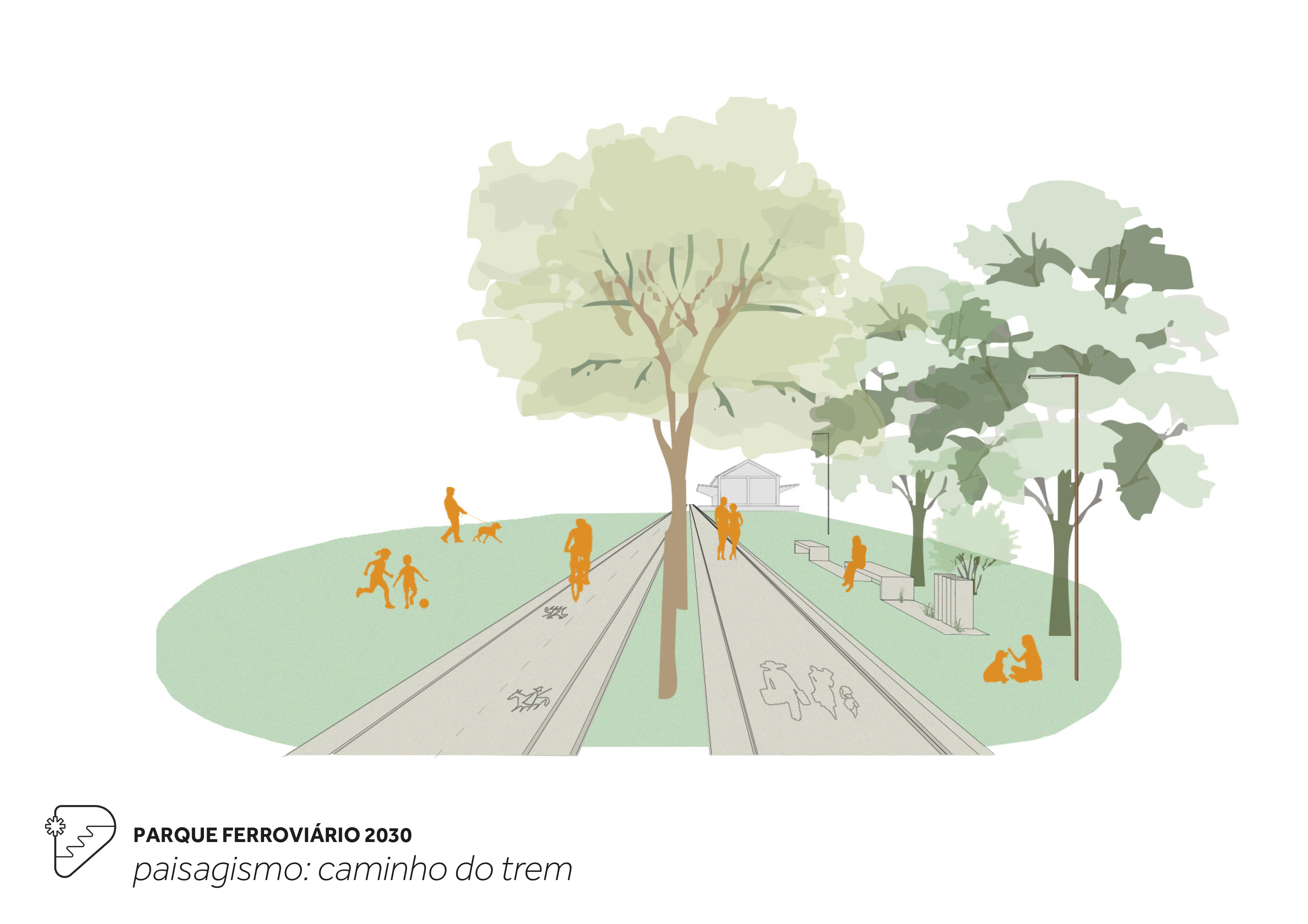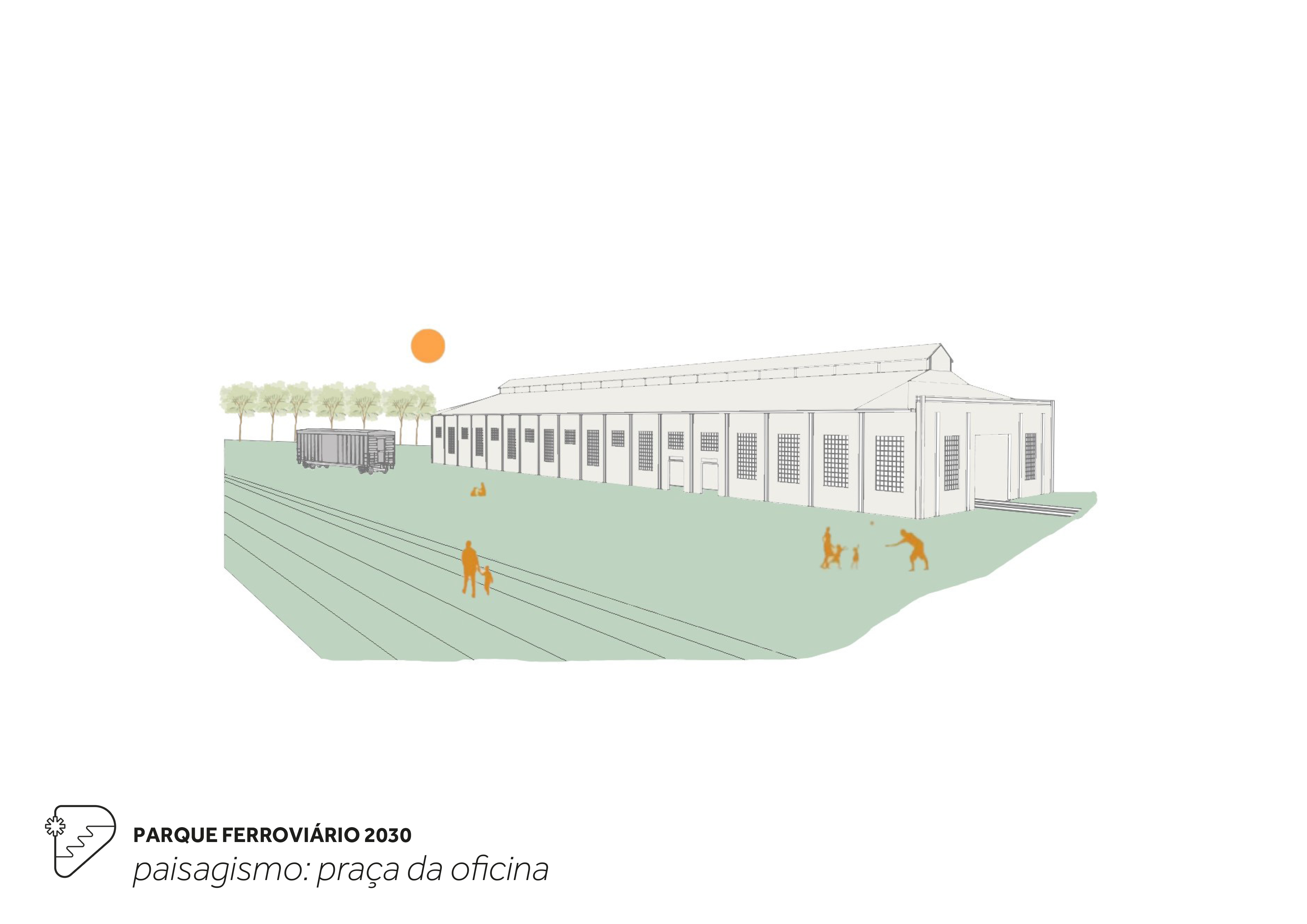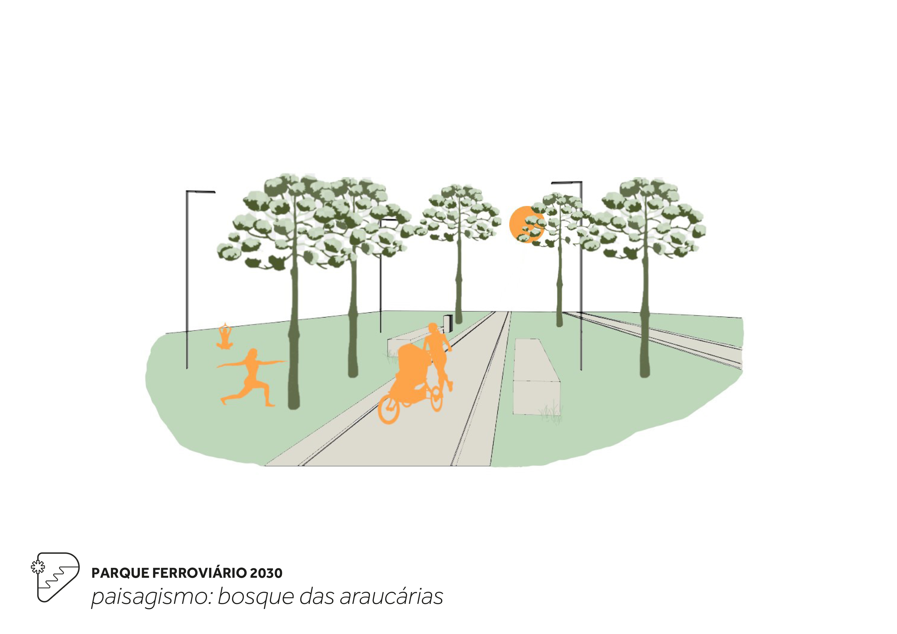 Recupera a memória dos trilhos que foram removidos após o encerramento da operação ferroviária nos anos 70-80, criando e recriando caminhos para pedestres e ciclistas que fazem submergir a linha principal de trem e suas derivadas que compunham o pátio de manobras. Estes novos/velhos caminhos organizam longitudinalmente em parque em setores: bosque de araucárias, pátio ferroviário, arena de eventos e praça da oficina. O talude atual é transformado em uma arquibancada para a cidade que conecta a rua frente às casas dos ferroviários.