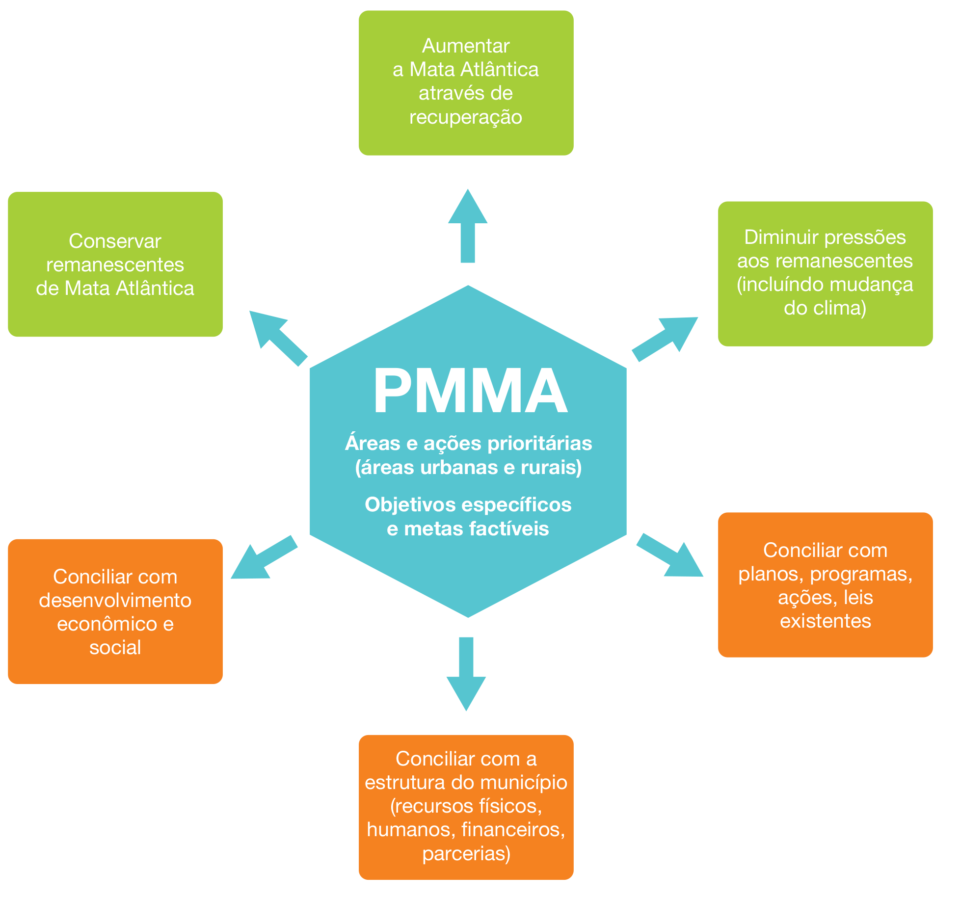 Considerando a importância e o grau de ameaça sobre o bioma, a Mata Atlântica foi protegida por lei específica, n°11.428/2006 e Decreto n° 6.660/2008, que a regulamenta. Esses aparatos legais exploram a possibilidade dos municípios, cujo território está total ou parcialmente inserido em seus domínios, atuarem proativamente na defesa, conservação e recuperação da vegetação nativa de Mata Atlântica. O Plano Municipal de Conservação e Recuperação da Mata Atlântica (PMMA), visa fortalecer a governança dos municípios para a proteção da Mata Atlântica aliada ao desenvolvimento econômico e social e está descrito no Art. 38. Serão beneficiados com recursos do Fundo de Restauração do Bioma Mata Atlântica os projetos que envolvam conservação de remanescentes de vegetação nativa, pesquisa científica ou áreas a serem restauradas, implementados em Municípios que possuam plano municipal de conservação e recuperação da Mata Atlântica, devidamente aprovado pelo Conselho Municipal de Meio Ambiente. § 1° Terão prioridade de apoio os projetos destinados à conservação e recuperação das áreas de preservação permanente (APP), reservas legais (RL), reservas particulares do patrimônio natural e áreas do entorno de unidades de conservação. § 2º Os projetos poderão beneficiar áreas públicas e privadas e serão executados por órgãos públicos, instituições acadêmicas públicas e organizações da sociedade civil de interesse público que atuem na conservação, restauração ou pesquisa científica no Bioma Mata Atlântica.